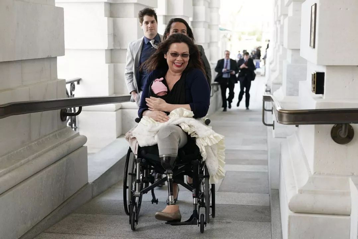 退伍以后,她没有自暴自弃,而是积极地参与社会活动,最终当选了美国历史上第一位残疾女性参议员,也成为第一位在任期内生孩子的女参议员。