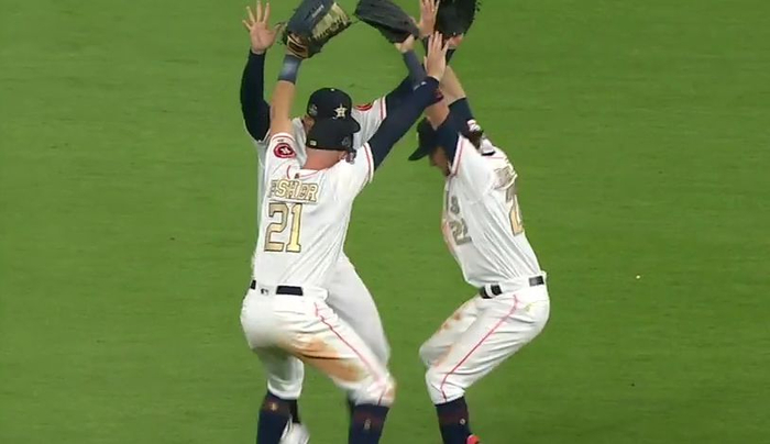 美国职业棒球联赛,球员们一起在场上大跳游戏《堡垒之夜》中的 Fortnite dance 舞蹈来庆祝胜利。《堡垒之夜》是今年很火爆的一款游戏。