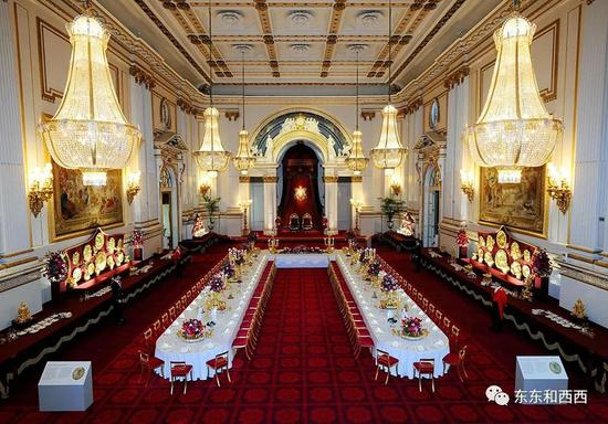 代表王权的白金汉宫大家都懂,红色+金色,有775个房间,出镜最多的是宴会厅↓↓