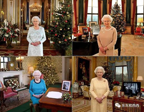每年英国女王都在白金汉宫发表圣诞讲话,只在白画室、音乐室、1844房间和摄政厅致辞(下图从左至右),每次镜头前的背景装饰都不一样↓↓