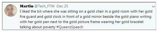 大家都是地球人,但眼看着“她在金色房间里,在摆着金钟的金色壁炉旁边,墙上挂着金框名画,背后一架金钢琴,坐着金边椅,戴着金镯用金笔,跟穷人们话家常,这才是女王啊”↓↓