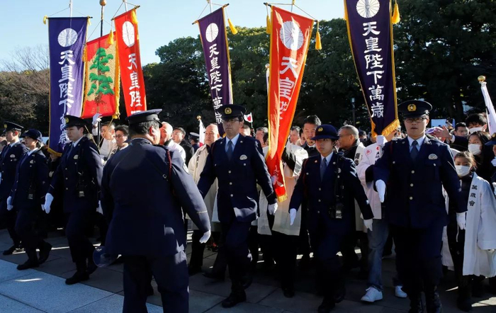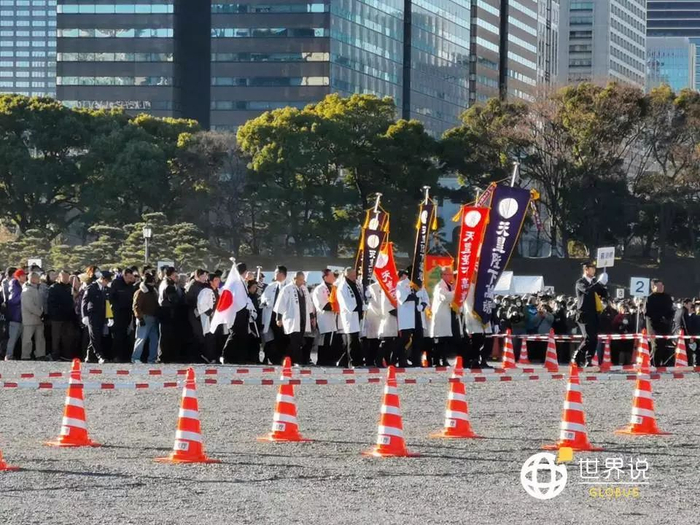 “请大家放心,这些是通宵排队的人,我们先让他们过来”。早上8点左右,警察一边通过大喇叭喊着,一边引导着通宵排队的人先行来到皇居二重门门口等待。走在最前面的十几个人很明显是右翼团体的人,他们举着“天皇陛下万岁”的旗帜,身披着日本国旗样式的衣服。按朋友说法,每年通宵排队的一般只有这十几个人,但今年在他们后面,又接连跟上了数百人,这意味着今年通宵排队的人可能是往年的几十倍。