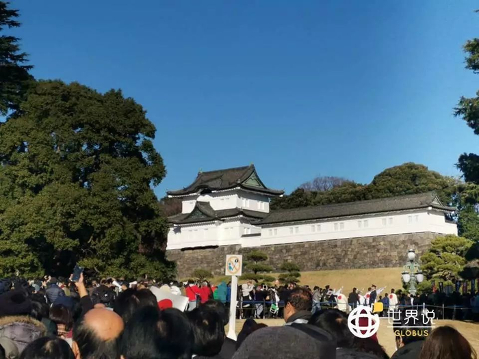 为了庆祝元旦,日本皇室每年都会在1月2日举行所谓“一般参贺”,即允许普通国民从平常不打开的皇居二重门进入,一步步走到长和殿外面的空地,面见天皇与全体皇族,这也是日本皇室与普通百姓沟通增进感情的一种重要方式。既然明确了是“一般参贺”,那么就是只要有兴趣来的人都可以进去,外国人也不加限制,事实上长和殿外面的指示牌还有英文、中文显示。