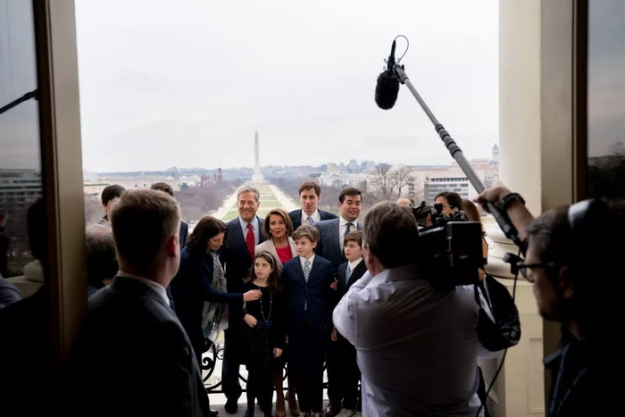 1月3日,新一届美国国会就职,包括佩洛西在内的很多议员都把自己的子女、或者孙子孙女带到现场感受气氛。佩洛西还带着家人照了一张合影。