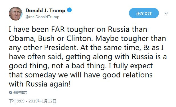 随后特朗普称,自己对俄罗斯的态度,比别的总统都来得强硬,但同时又觉得,与俄罗斯和睦相处是好事,不是坏事。“我完全期待有一天我们会再次与俄罗斯建立良好关系!”