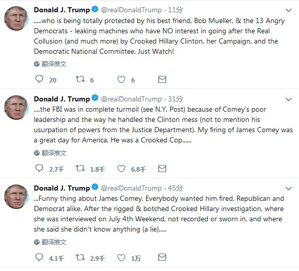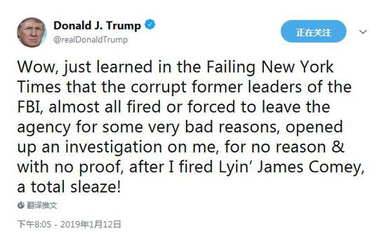 特朗普第一条推特称,“从失败的《纽约时报》那里得知,腐败的FBI前领导人,几乎都因为一些非常糟糕的原因被解雇或被迫离开该机构的人,他们曾经在毫无理由和证据的情况下调查我,我解雇了撒谎的詹姆斯·科米,他真是个卑鄙小人!”
