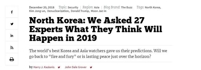 考虑到朝鲜核武计划的利害关系,美国《国家利益》杂志邀请了请世界范围内多位专家进行2019朝核问题的最理想、最乐观的预测。在这些预测中,专家们的观点主要围绕一下三个问题:1。朝鲜是否会放弃核武器?2。美国的策略是否需要转变,如何转变?3。第二次朝鲜战争是否一触即发?即使是最乐观的预测,专家们对这些问题的看法仍差异巨大,见仁见智。