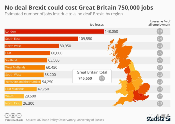 据Statista预测,无协议脱欧可能会导致英国失去75万个工作岗位,而这其中,以生活成本高著称的伦敦更是在这次经济衰退中首当其冲。