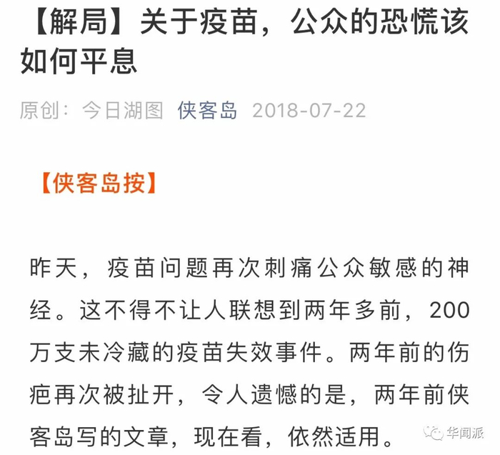 去年7月,山东被曝假疫苗案,孩子的健康成为牟利的工具,人民日报海外版公众号“侠客岛”专门刊文来平息公众恐慌。