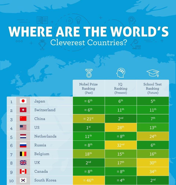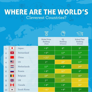 研究机构Vouchercloud根据诺贝尔奖数量、目前平均智商和“受教育程度”(指代下一代人的潜在智力水平)为标准进行排名。研究者希望这三项指标能反应过去、现在和将来的智力变化。