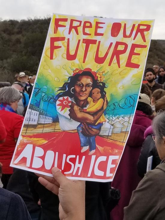 我挤进人群,拿起相机,一名集会者看到我,立即举起手中的海报,配合拍照。海报上写着“释放我们的未来”以及“废除ICE(美国移民与海关执法局Immigration and Custom Enforcement的缩写)”。