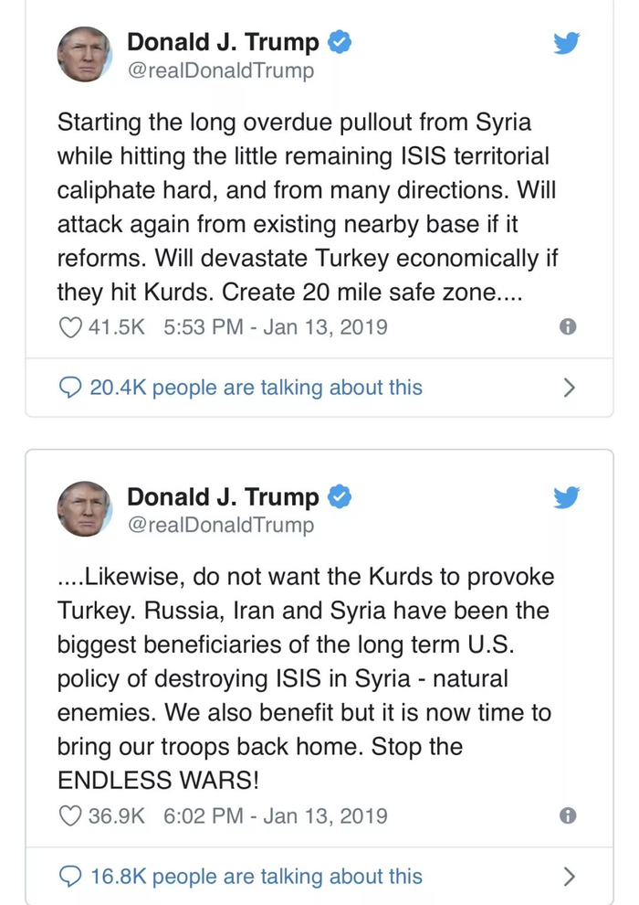 在叙利亚撤军问题上,特朗普于1月13日下午5点53分和6点02分连发两推,突然放出狠话: