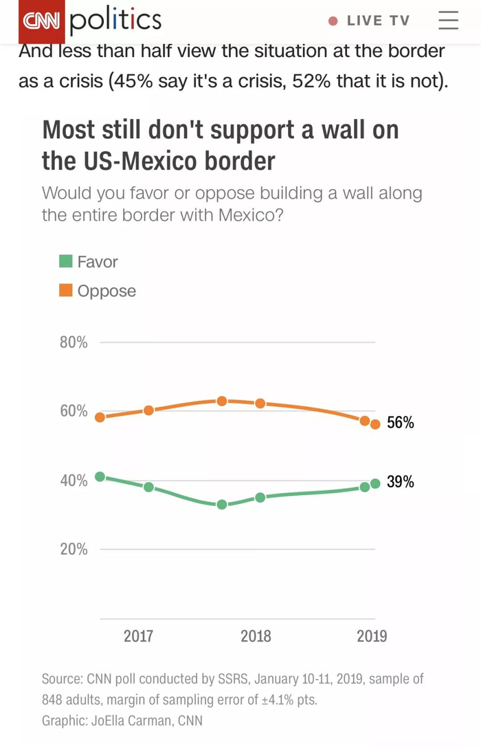 2019年1月13日, 根据美国有线电视新闻网 (cnn) 进行的一项最新民调显示, 就政府关门事件, 特朗普需要比国会中的民主党人承担更多的责任; 自上个月以来, 总统的不支持率攀升了5个百分点。