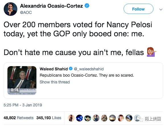 左派也出来个在社交媒体上飞跃建制派、玩转推特的代表了,还是21世纪新新人类款型的。比如宣誓就职那天被共和党嘘了后,AOC在推特上写几十个字控诉一下,(大意是)“有200多个投票Pelosi的众议员,共和党只挑我做靶子骂”。轻松几笔,就赚到近5万转发兼几十万点赞。