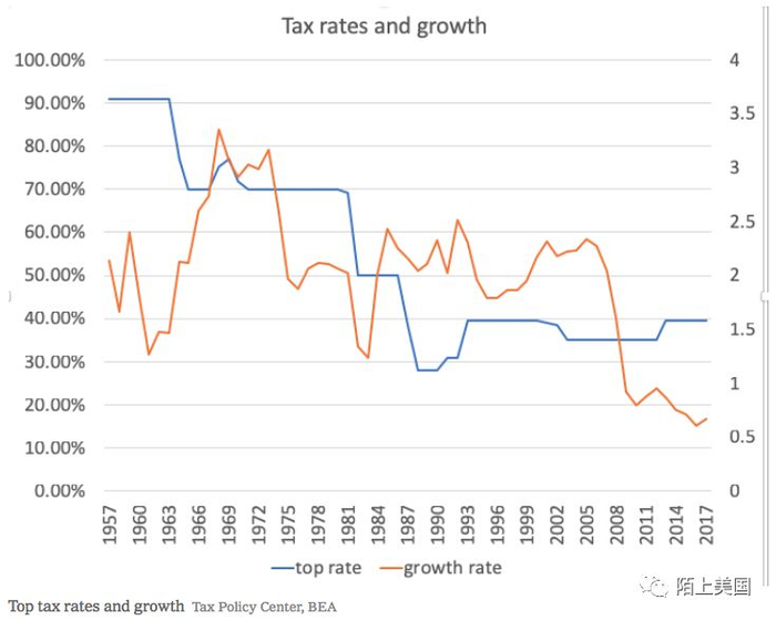 二战以后,美国最高个人税率最高一档达到过90%以上,后来一直维系在70%以上。直到里根政府大减税,一下到40%多的档位。里根的减税“涓流经济(Trickle down)”在党内初选中被老布什戏称为“巫术经济(Voodoo economics)” (点击查看前文🔗)。
