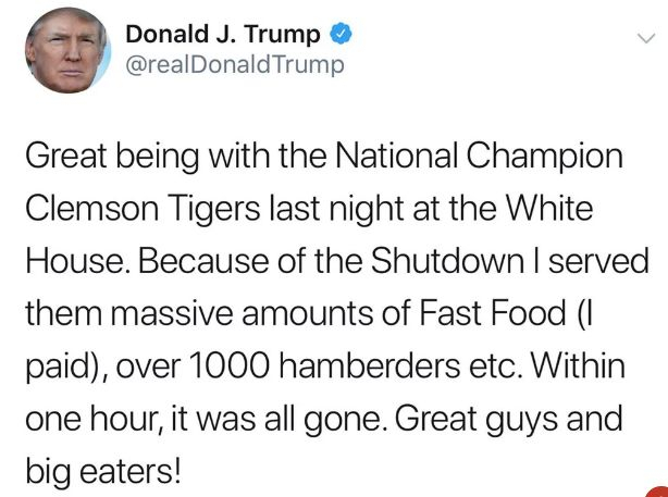 特朗普发推特炫耀说:“因为政府关门,我自掏腰包给克莱姆森老虎队准备了1000个汉堡。”