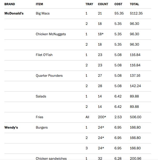 《华盛顿邮报》也凑热闹,指出现场汉堡只有177个,还根据现场图列表统计了这一顿快餐花费约2911.44美元,对于超过百人的橄榄球队根本不够吃。
