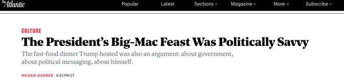 《纽约客》发文表示,特朗普请客吃快餐这件事很自然,因为他是狂热的快餐爱好者,相比白宫大餐,他很多时候宁愿吃汉堡。所以,用自己喜爱的食物招待宾客,也是特朗普做事简单直率的体现。