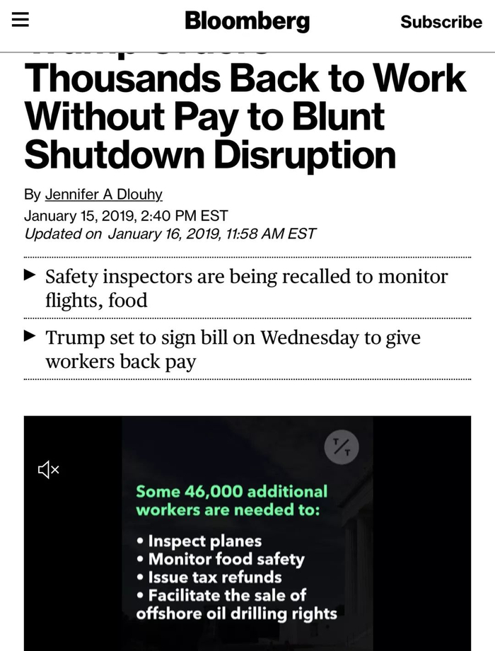 Due to the Shutdown, I am sorry to inform you that your trip to Brussels, Egypt, and Afghanistan has been postponed。 We will reschedule this seven-day excursion when the Shutdown is over。 In light of the 800,000 great American workers not receiving pay, I am sure you would agree that postponing this public relations event is totally appropriate。 I also feel that, during this period, it would be better if you were in Washington negotiating with me and joining the Strong Border Security movement to end the Shutdown。 Obviously, if you would like to make your journey by flying commercial, that would certainly be your prerogative。