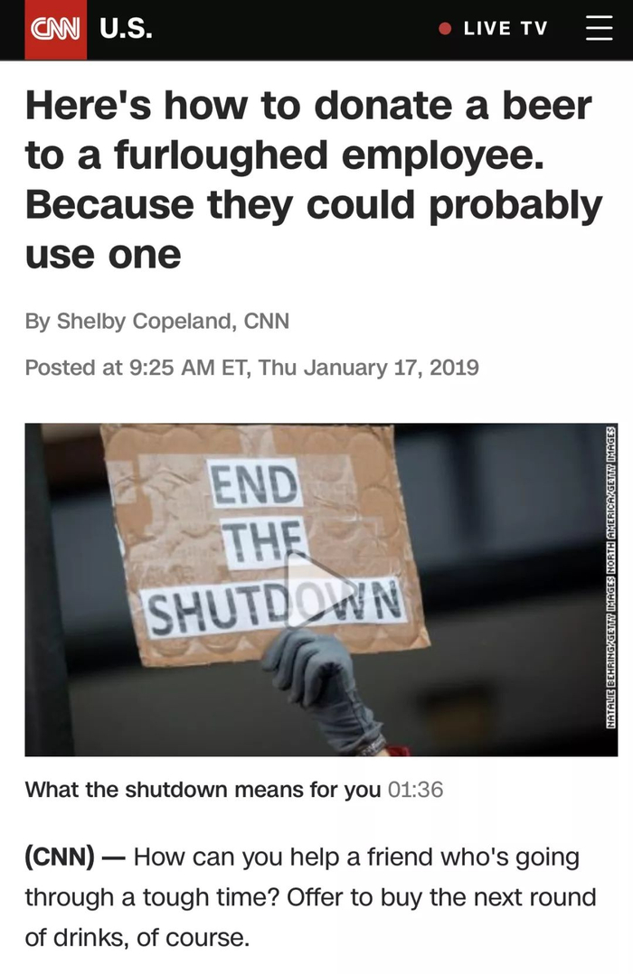 真是一方公务员有难,八方民众来支援。这些公务员也是普通民众,许多人是两党政治互杀的牺牲品,但再怎么说,也不能让公务员和公务员的家人挨饿;否则,美国真的是国运到头了。