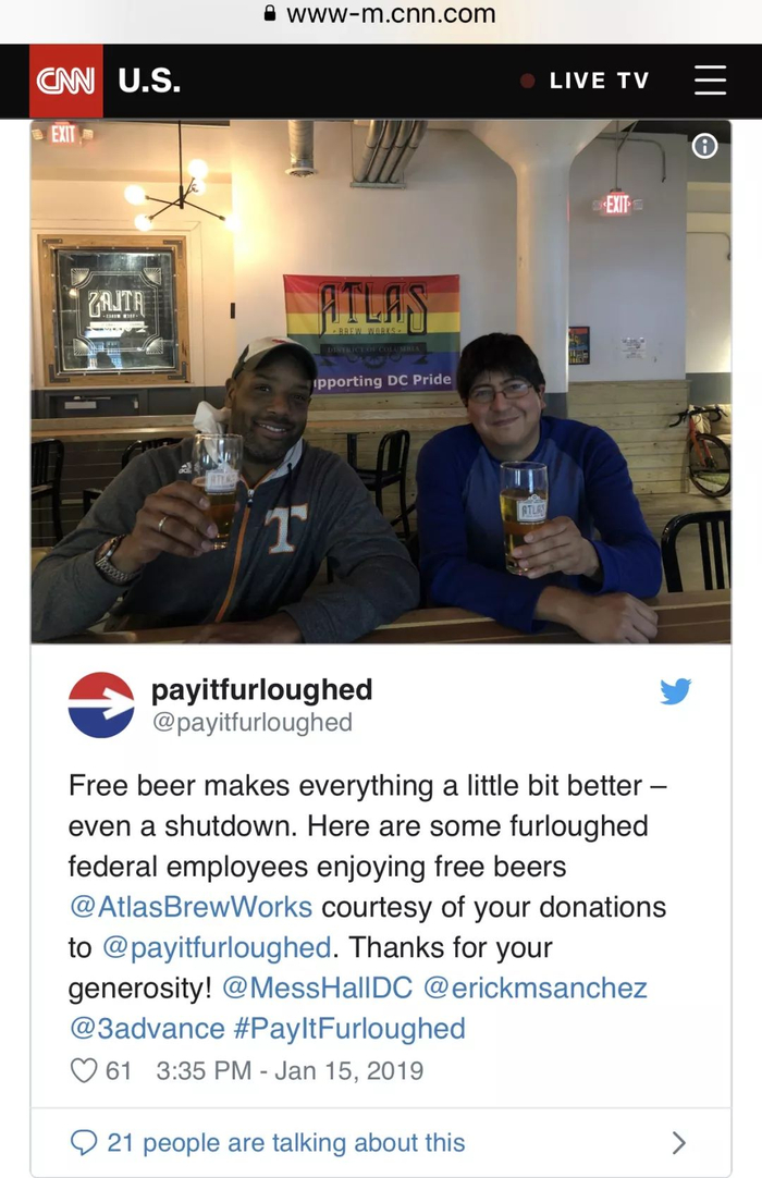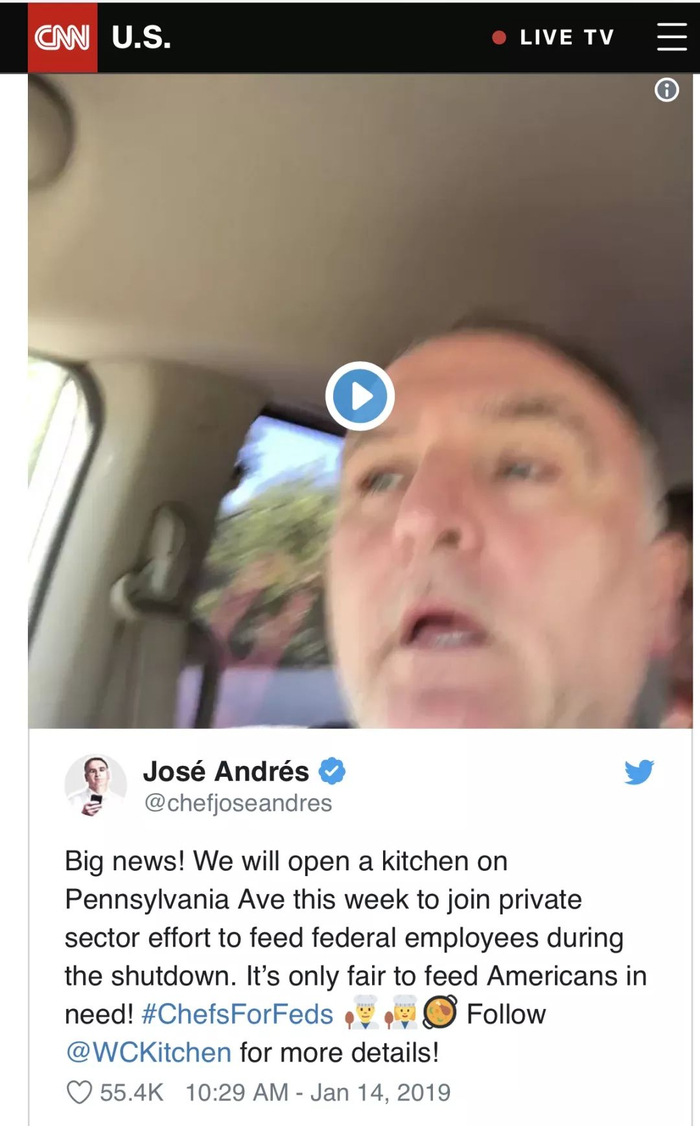 也有一些热心歺馆人士发出广告,称愿意向公务员提供免费就餐,并说向处于困境的美国人提供帮助是一件友善的事。