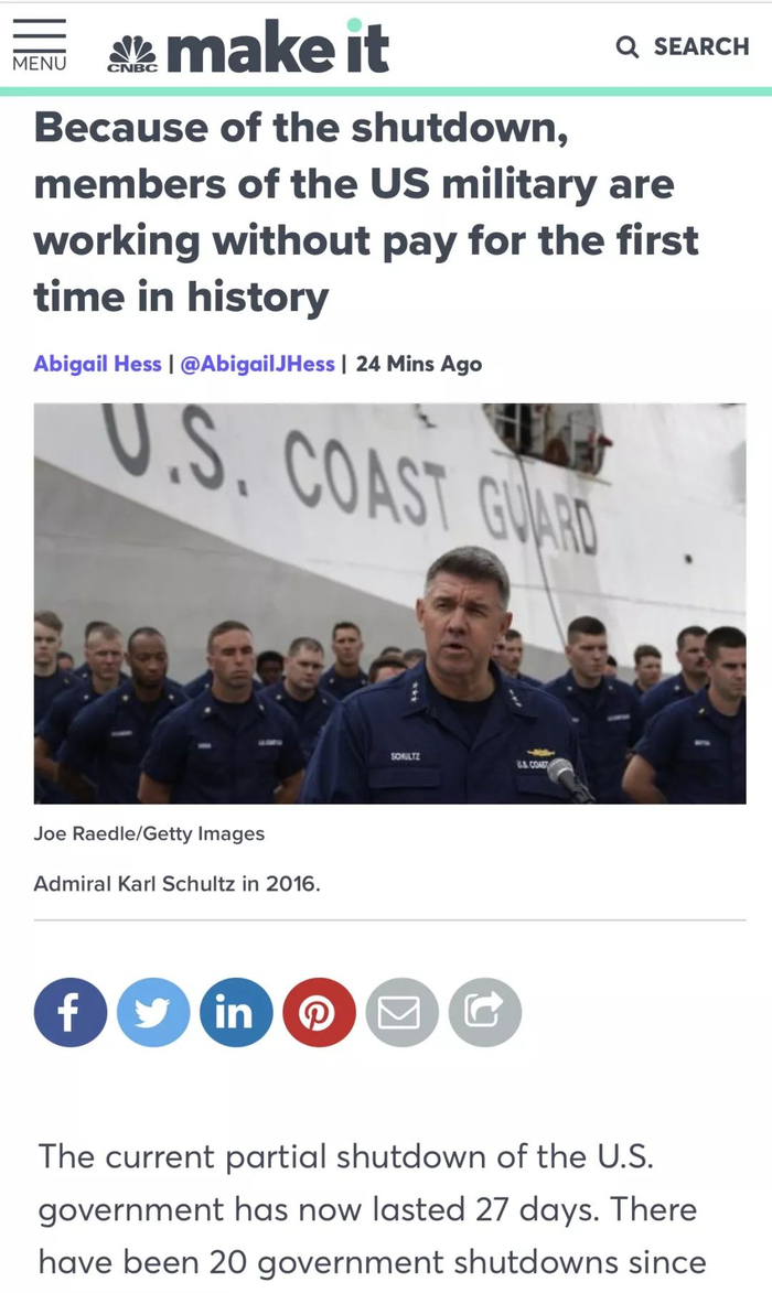 有超过四万名海岸警卫人员虽然没有领到工资,但是还不得不坚守岗位,这是美国历史上首次出现。