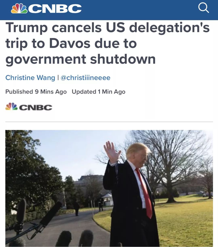 而同样在今天,据CNBC报道,由于美国政府关闭,特朗普取消了派团参加今年在瑞士的达沃斯论坛;此前特朗普已经表态自己不去凑热闹,派财长带队去,没有想到今天干脆就说美国不派人去了。