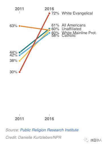 另外,2011年PRRI民调发现,只有30%的白人福音派人士认为“在个人生活中犯下不道德行为的民选官员仍然可以在道德上行事并履行职责。” 到2016年,百分比升高到72%。这中间为什么会产生这么大的落差呢?