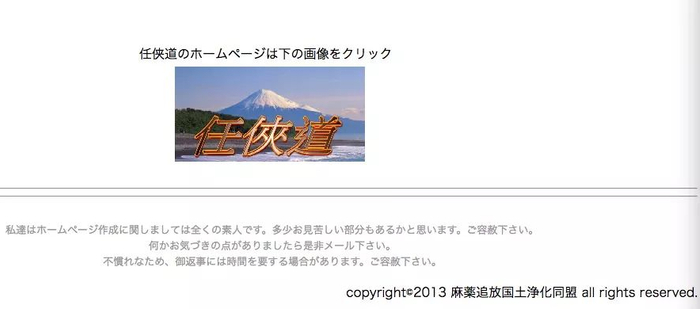 2014年,山口组建立了一个名为“驱逐毒品国土净化联盟”的官方网页。页面背景为白色,文字为黑色,除了一行醒目的网页名称和一行导引出视频、照片和活动介绍的分栏外,几乎都是留白,简洁而不失混乱。而在页面底部通常标注版权的地方写有这样一段蠢萌的文字: