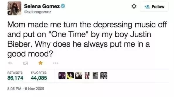 有一天,赛琳娜在推特上写道:“妈妈让我关掉让人绝望的音乐,多放放我的男孩比伯的歌。为什么他总能给我带来快乐?”