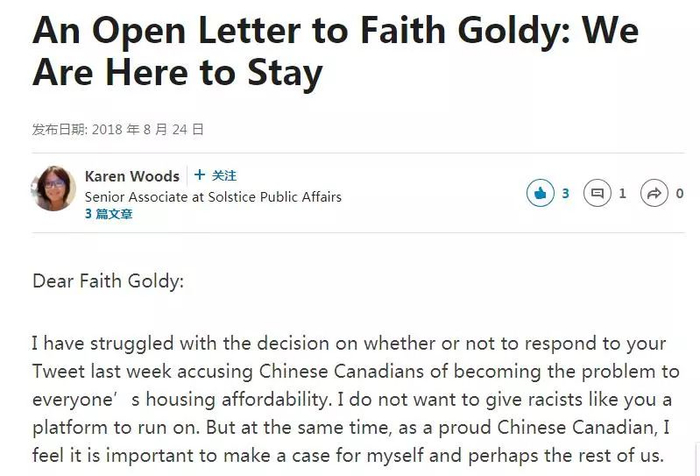 而这些打着“多伦多人至上”的标语,其实是“白人至上”理念的延续,本质上还是种族主义言论。这条颇具歧视含义的房价推文,随即引起许多多伦多华裔的不满。有一位华人就在Top Buzz和LinkedIn上发布了写给格尔迪的公开信。