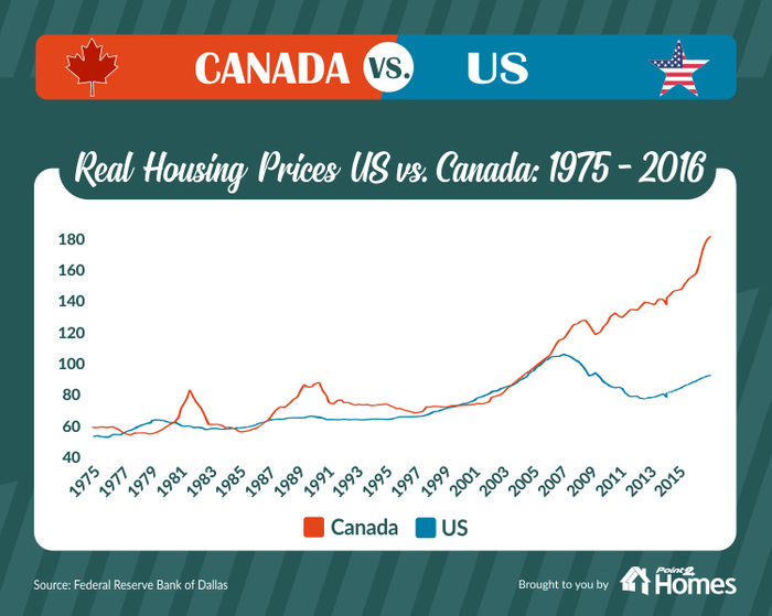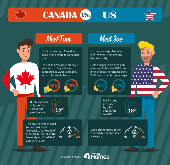 为了得到客观的概况,房地产市场Point2 Homes分析了加美两国房地产市场趋势的历史数据,深入研究了2008-2018年的数据。这家机构使用的具体指标是房价中位数、租金、收入中位数,以及房屋所有权率。