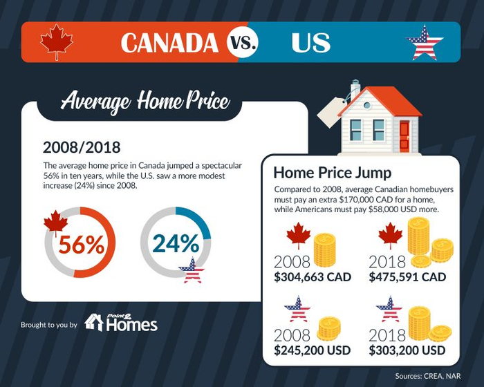 房价方面,自2008年以来,加拿大的平均房价从304,663加元升至475,591加元,上涨56%。同期美国平均房价从2008年的245,200美元,升至2018年的303,200美元,上涨24%。