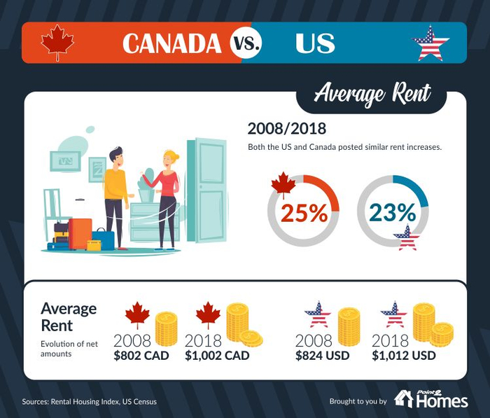 过去十年,两国的租房比例不断上升,随之平均租金也不断上涨。在加拿大,平均租金在十年内增长了25%,从802加元涨至1002加元。美国的情况类似,平均租金自2008年以来增长了23%,从824美元涨至1024美元。