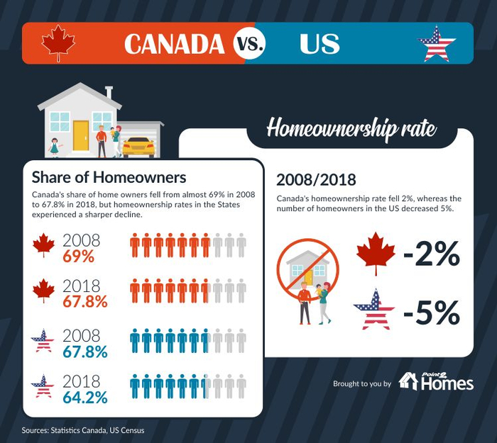 买房子不仅是美国梦的一部分,加拿大人也共享了这个梦想,加拿大的房屋所有权率甚至更高。在加拿大,住房拥有率稳步上升超过40年,在2011年创下69%的历史最高水平,但在2014年经济衰退后,这一比例在2018年下降至67.8%。这是近半个世纪以来,房屋所有权率首次在加拿大有所下降。