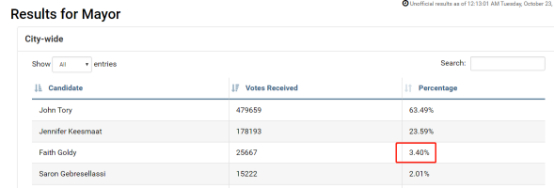 不过竞选结果证明,群众的眼睛是雪亮的。在去年10月安省的市长选举中,现任市长詹德利共获得479659张选票,最终以63.49%的得票率高居榜首,获得。而颇受华人支持的极右翼候选人格尔迪(Faith Goldy)仅获得25667长选票,得票率为3.4%,不足詹德利的零头。