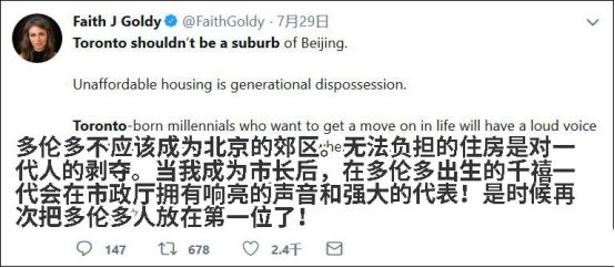 2018年7月底,正在参选多伦多市长的格尔迪(Faith Goldy)发布了一则推文,称“多伦多不应该成为北京郊区”,暗示是华人推高多伦多房价,剥夺了当地人享受相应资源福利。对于如何解决房价问题,她不过是大喊一声口号,“是时候再次把多伦多人放在第一位了!”。