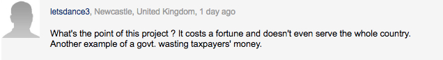 “这个项目的意义是什么?它耗资巨大,甚至不为整个国家服务。这是政府浪费纳税人钱的又一个例子。”