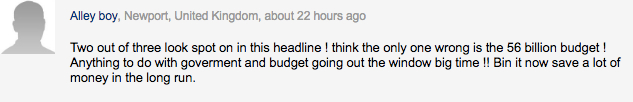 “三分之二的人在这个标题上看对了!认为唯一错误的是560亿的预算!任何与政府和预算有关的事情都会被抛到九霄云外!!从长远来看,现在停止项目可以节省很多钱。”