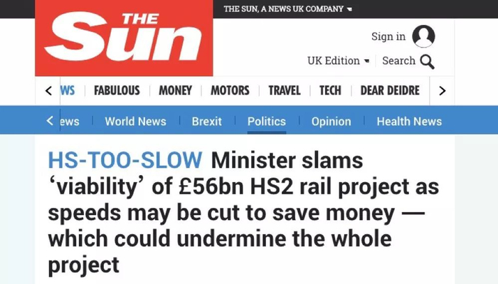 《太阳报》:内阁部长猛烈抨击价值560亿英镑的HS2铁路项目的“生存能力”,如果降速为了省钱,这可能会破坏整个项目!