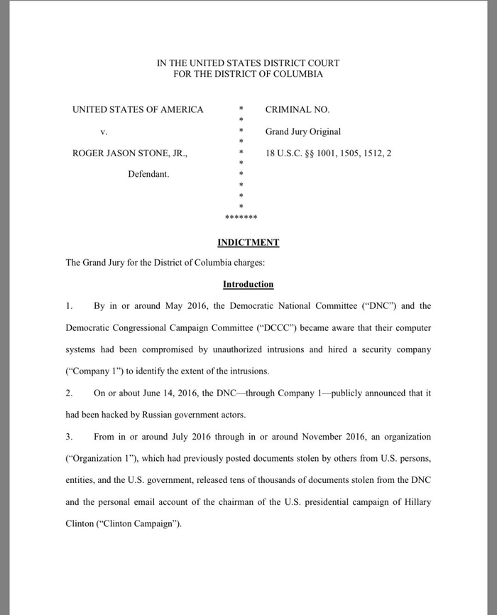 斯通在竞选期间曾暗示他有黑客获取的数据,可能让民主党人、包括特朗普的总统竞选对手希拉里·克林顿难堪。他的这番话引起关注。联邦检察官在起诉书中指称,斯通发送并接收了大量电邮和短信,讨论了“一号组织、其首领及其所掌握的被黑电邮”。