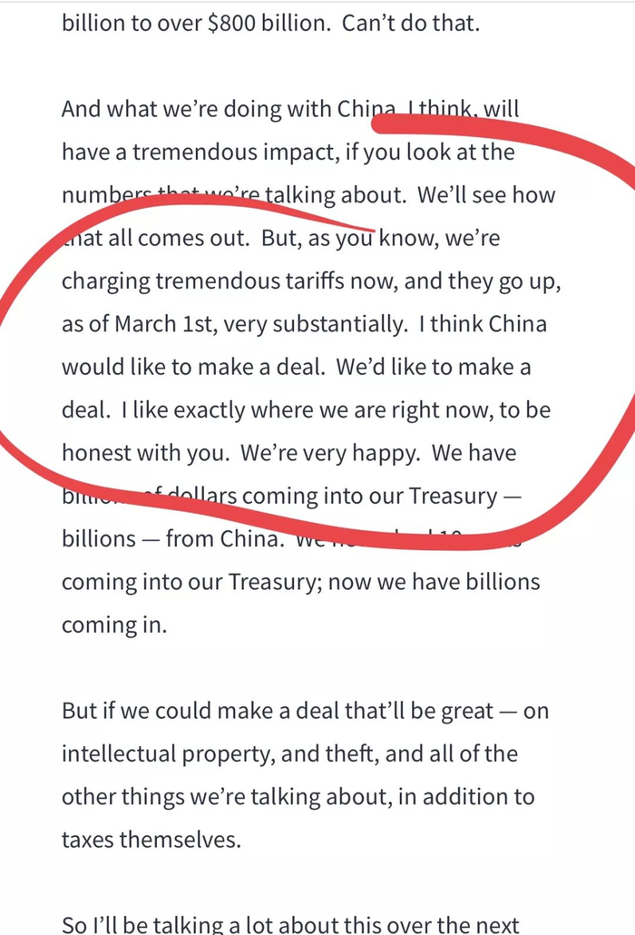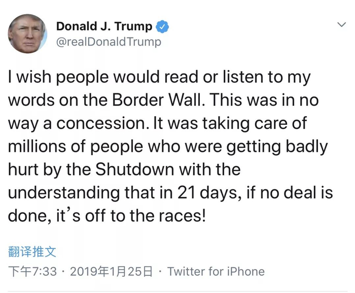 我希望人们能读到或者听我在建墙这件事上所说的话。这决不是让步。我的决定是为了照顾数百万因政府关门而受到严重伤害的人,因为他们明白,如果21天内不达成协议,就得继续斗下去。。。。。。。