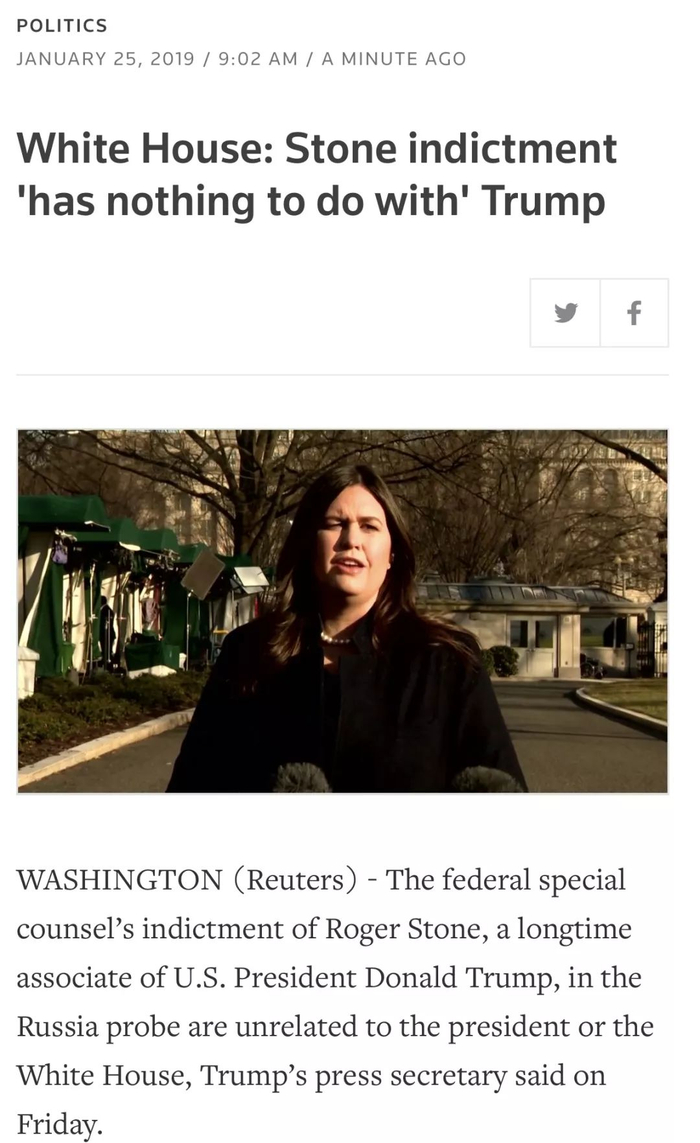 白宫发言人萨拉·桑德斯在接受有线电视新闻网(CNN)的采访时说:“对斯通先生的指控与总统毫无关系,与白宫毫无关系。总统没有做错任何事情。”