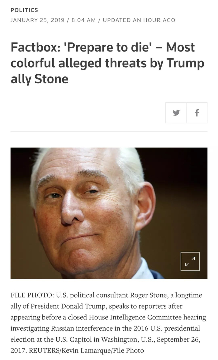特朗普总统的一名竞选顾问罗杰·斯通(Roger Stone)因几项刑事指控而被逮捕。这些指控源自特别检察官对俄罗斯干涉2016年美国大选的调查。斯通随后在法庭露面,交付25万美元的保释金后获释。