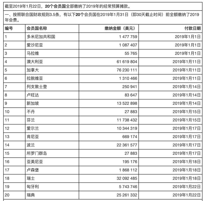 联合国秘书长古特雷斯今年1月11日写信给联合国193个会员国,告知目前会员国拖欠联合国维和行动的经费高达20亿美元,其中美国的欠款占到三分之一。据测算,截止今年1月1日,美国拖欠联合国的常规预算金额为3亿8100万美元,拖欠的维和经费为7亿7600万美元。