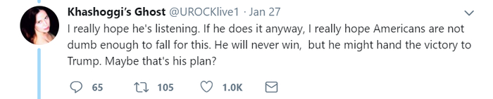 ”如果你以独立人士去竞选,你只会分走反川普的票数,再让我们陷入四年的不幸中。优先考虑下国家利益而非个人自尊吧。要么以民主党名义去竞选,要么不要参加竞选!!我们的未来堪忧啊!“