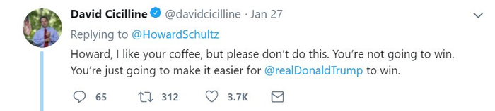”霍华德,我喜欢你的咖啡,但请你不要参加竞选。你不会获胜的。你只会让川普更轻而易举地赢得连任呐。“