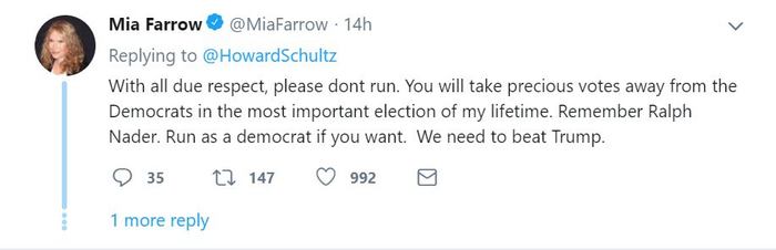 ”恕我直言,请别去竞选。您去竞选只会把民主党选票从我生命中最重要一场选举中分走。想想拉尔夫·纳德。非要竞选的话,就以民主党身份竞选。我们必须打败川普。“