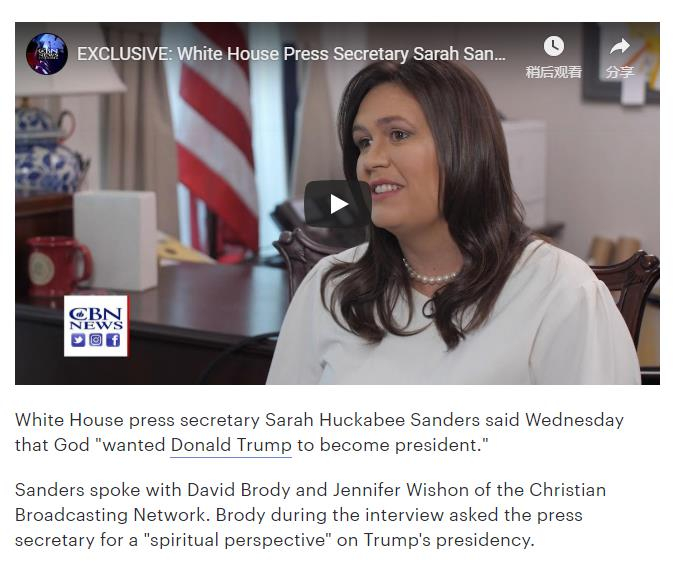 本周三,白宫新闻发言人莎拉·桑德斯接受基督教广播网的采访时表示“特朗普是天选之子”。
