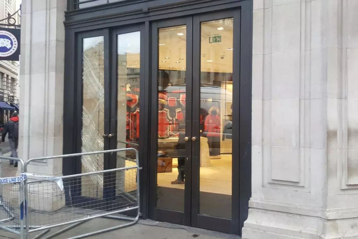 去年在英国伦敦曾经发生过加拿大鹅专卖店被抢事件。劫匪用锤子砸碎了商店橱窗,控制了看守商店的警卫,进店疯狂“扫货”,拿了衣服就跑。